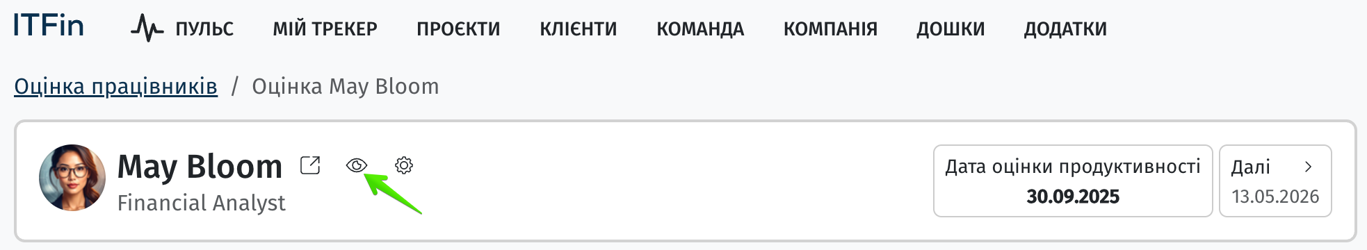 При створенні в ITFin нового користувача та зазначенні йому Дати кінця випробувального періоду в розділі Оцінка працівників на цю дату автоматично створюється Оцінка випробувального періоду.
