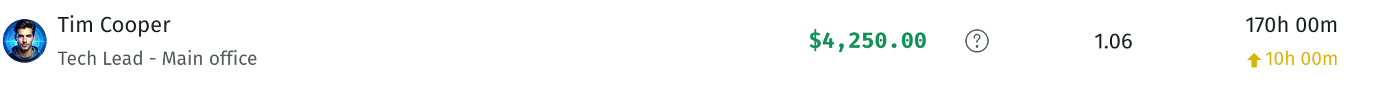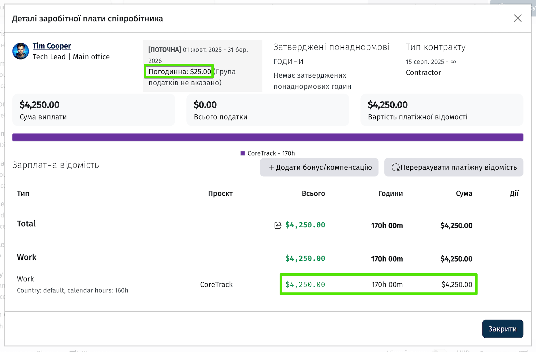 Наприклад, якщо ставка становить 25$ за годину і працівник за місяць відзвітував 160 годин (норму місяця).