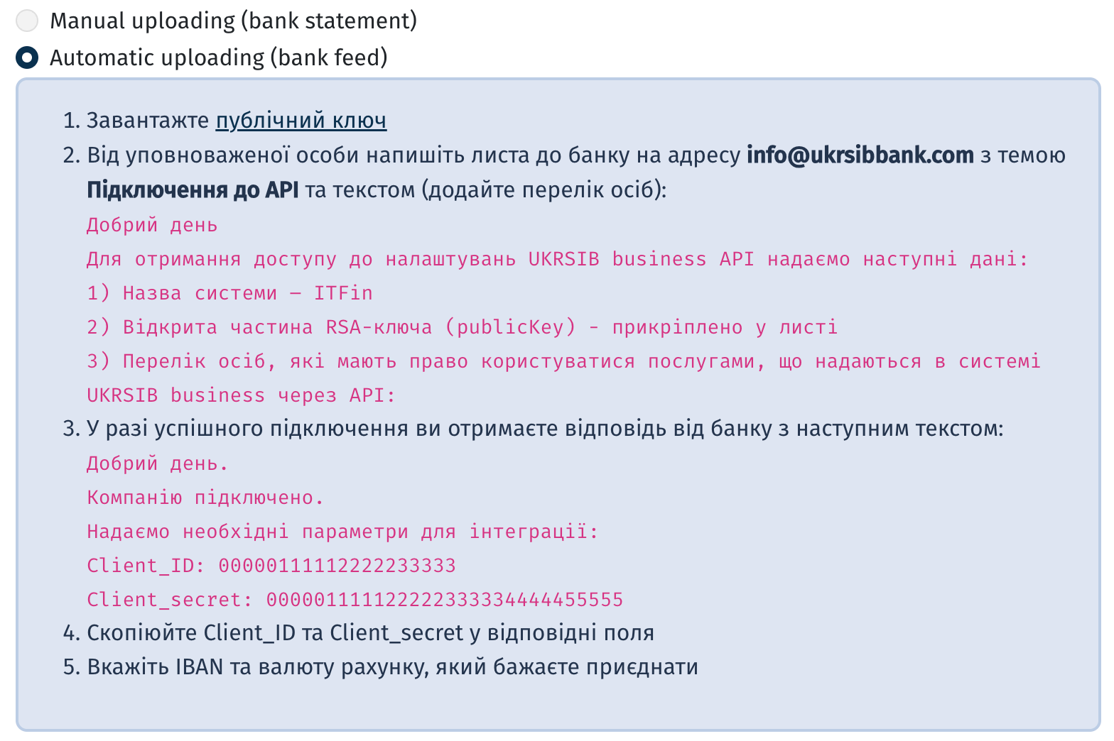 • Окремі ClientID та ClientSecret, видані банком саме для цього користувача.