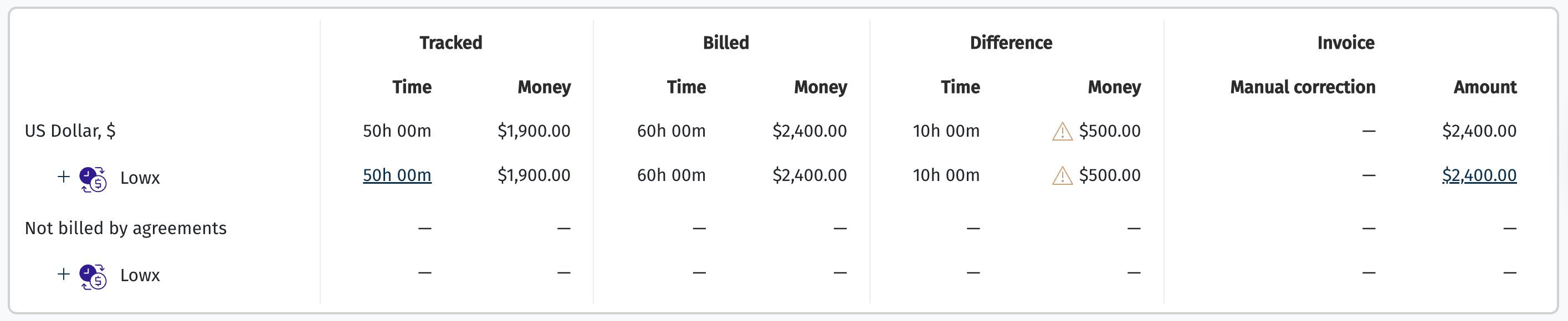 • Billed — години та сума, виставлені в інвойсі (визначаються по періоду інвойсування).